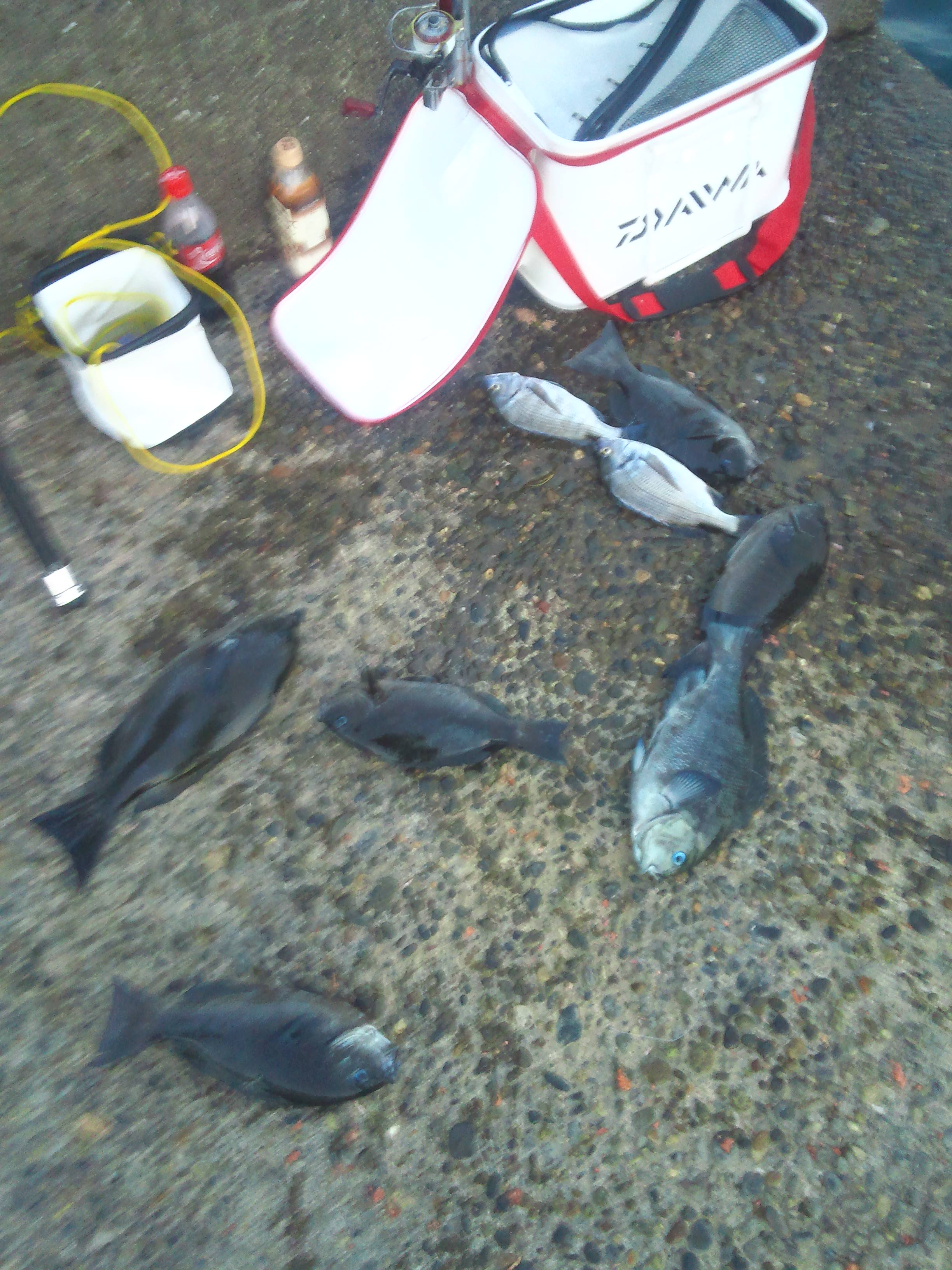 前日の予報で中止とのことだ。 すでにみんなオキアミ解凍頼んでしまってたので どっか行こう会 でまずは勝浦に集合 その辺でいつものようにカイズ釣りでも と思っていたら 常務が知らぬ間に岩瀬渡船へTEL アシカも乗れるとの事 まさかの展開で鴨川を目指す。 しかし1番船で帰ってきた船長は アシカは無理との事 ウネリで 人数が入れないとの事 他の磯も空いてるが ウネリでのれないようだ 次はソーナンス森ちゃんが 乙浜へTEL 大丈夫のようだ! またまた急いで南房総へ! やっと釣りが出来る! 終わってみると良型揃いの好釣果! |